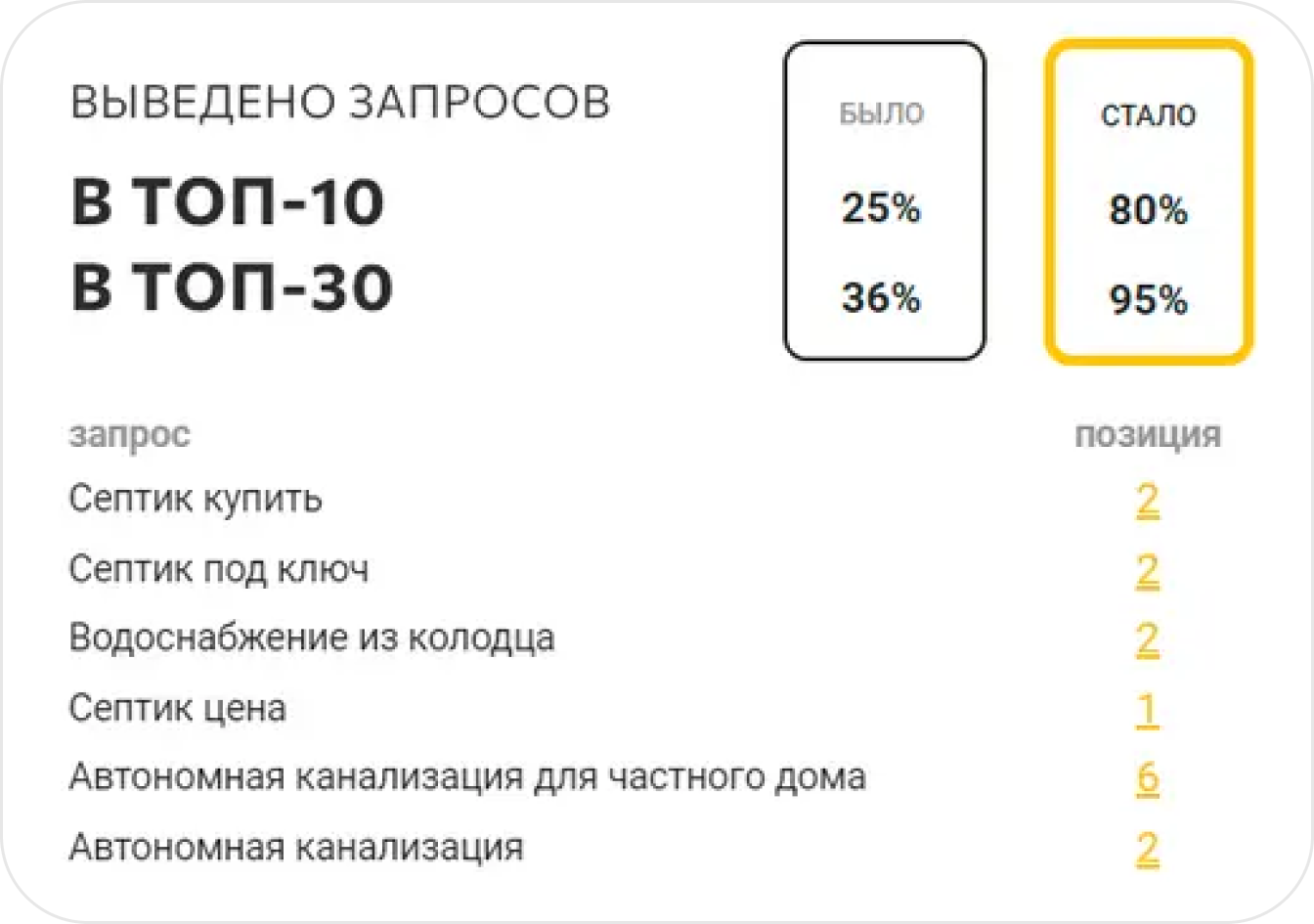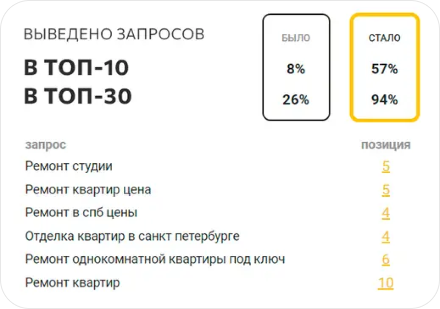 Даже если вы перестанете платить нам в какой-то момент, ваш сайт уже не упадёт в чертоги поисковиков. Плавно сайт опустится ниже ТОПа, но по каким-то запросам останется наверху, благодаря качественной оптимизации.